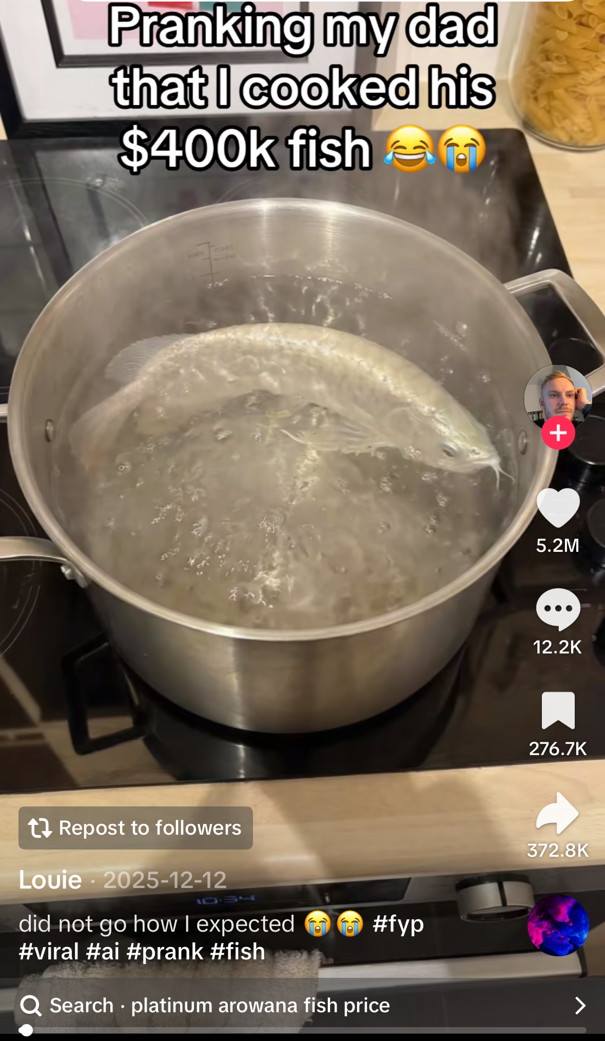 "Not much to report here, except that AI pranks are clearly here to stay. This one racked up 1.9 million views and over 1.7k comments in just three days. Since November, this account has pulled in more than 80 million views from AI prank content alone."